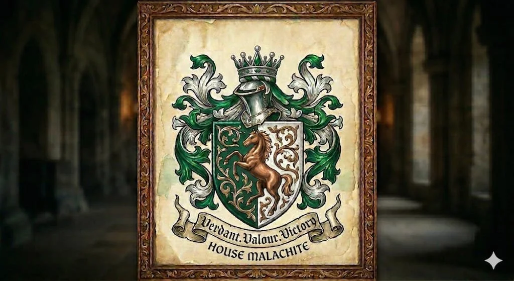 With the name and its vibrant green colour coming from the Malachite mineral in the ground combined with the honourable Aldric’s love for his twin brother. The horses the sigil was chosen as a homage to Edric as he was the most talented rider on there home world. Thus was House Malachite forged: a lineage of strength, loyalty, and enduring brotherhood.